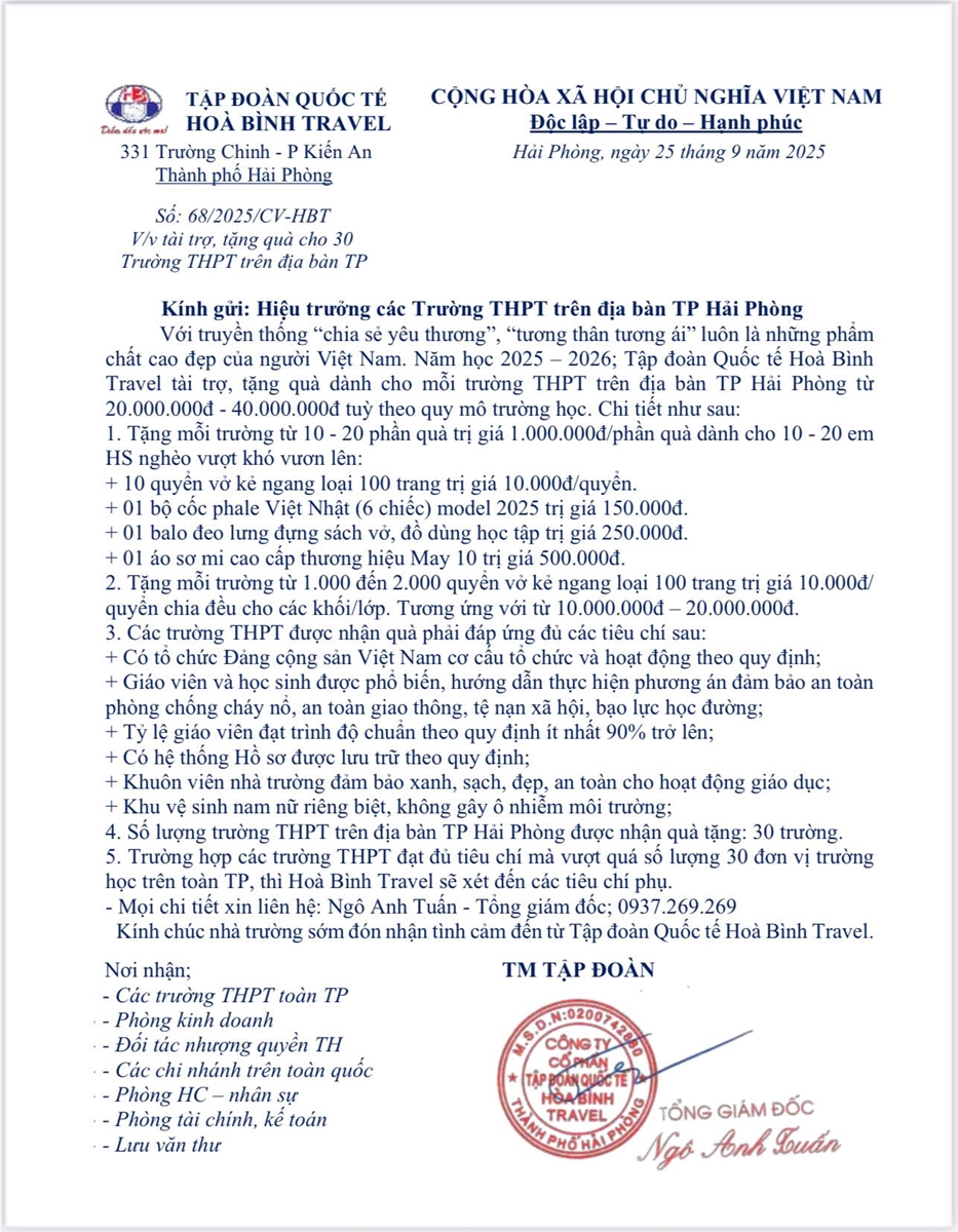 CÔNG VĂN SỐ 68/2025/CV-HBT V/V TÀI TRỢ, TẶNG QUÀ CHO 30 TRƯỜNG THPT TRÊN ĐỊA BÀN TP