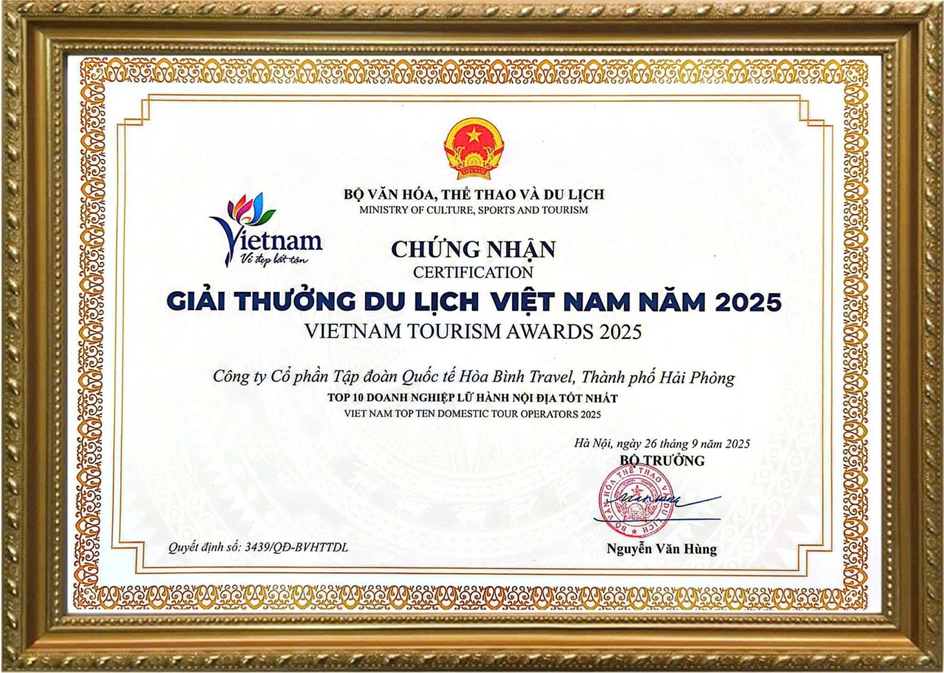 Trong buổi lễ, Tập Đoàn Quốc Tế Hoà Bình Travel tự hào được xướng tên ở hạng mục Top 1 Doanh Nghiệp Lữ Hành Tốt Nhất Việt Nam 2025. Thành tựu này khẳng định vị thế tiên phong của Hoà Bình Travel trên thị trường công ty du lịch uy tín, đồng thời ghi nhận hành trình hơn 20 năm không ngừng đổi mới và phát triển.